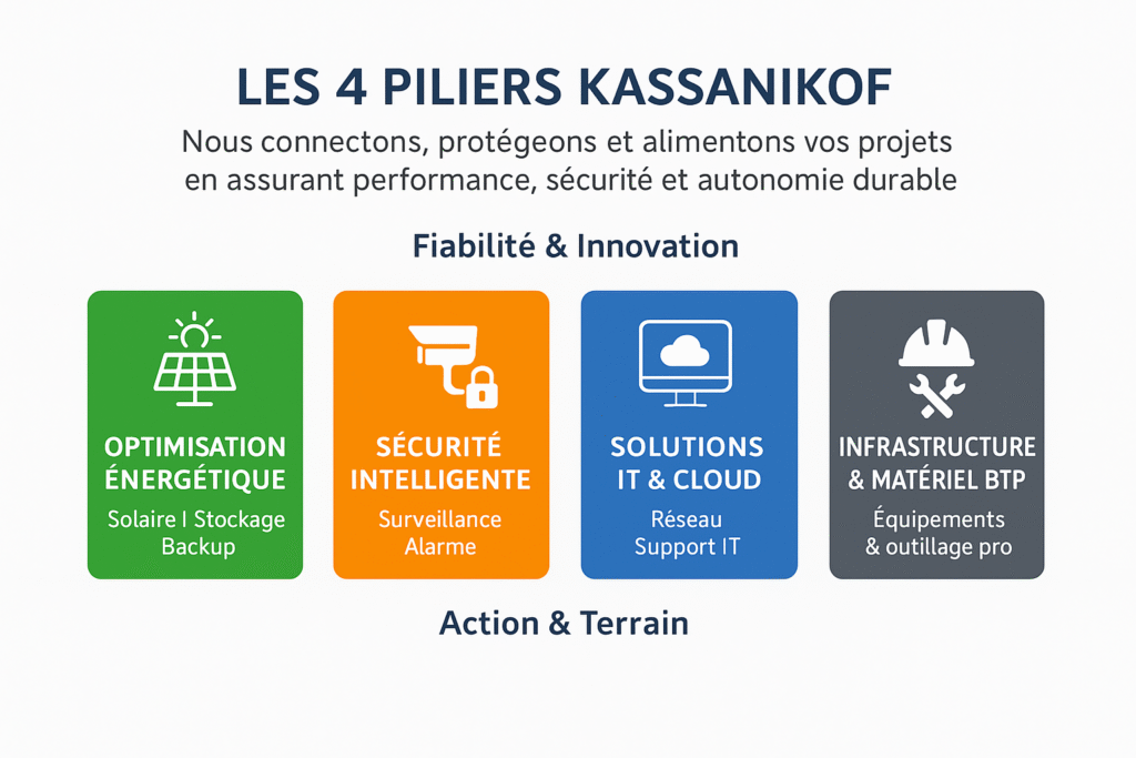 KASSANIKOF s’engage à offrir des solutions techniques fiables et accessibles pour répondre aux défis du monde moderne. Entre informatique, énergie solaire, sécurité et matériel BTP, nous aidons nos clients à gagner en autonomie, en performance et en tranquillité d'esprit. Chaque projet est traité avec sérieux, expertise et passion.